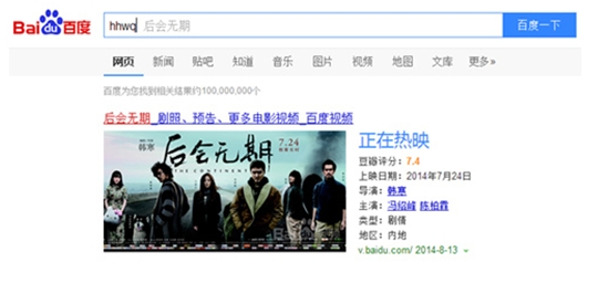 網友如想搜索"爸爸去哪兒",只需在搜索框中輸入"爸爸",百度便會預估個性化搜索需求,以灰色字體"猜"出網友想要的搜索結果,即時顯現(xiàn)內容。即便網友的輸入很模糊,只有幾個字符"hhwq",智能預測也會快速轉化成關鍵詞"后會無期",進行頁面展現(xiàn),真正做到"先知"。